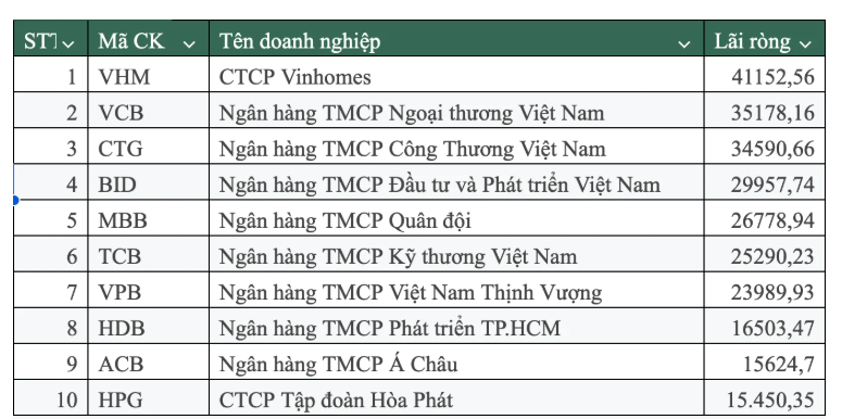 8 cái tên còn lại đều là các ngân hàng. Theo đó, BIDV (mã: BID), VietinBank (mã: CTG) có mức lãi ròng trên 11.000 tỷ đồng. Các ngân hàng MBBank (mã MBB), Vietcombank (mã: VCB) và VPBank (mã: VPB), Techcombank (mã TCB) và HDBank (mã HDB) đều hiện diện trong top 10 với mức lãi ròng đều vượt hơn 5.000 tỷ đồng trong quý IV/2025, phản ánh vai trò trụ cột của ngành ngân hàng.