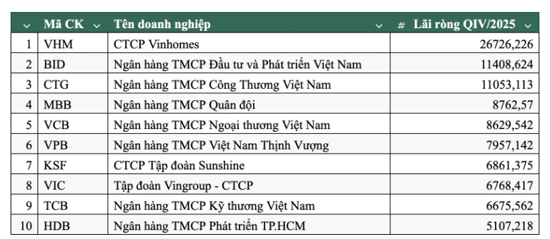 Top 10 doanh nghiệp báo lãi lớn nhất quý IV/2025 và năm 2025 có sự góp mặt quen thuộc của các đơn vị trong nhóm ngân hàng và bất động sản.