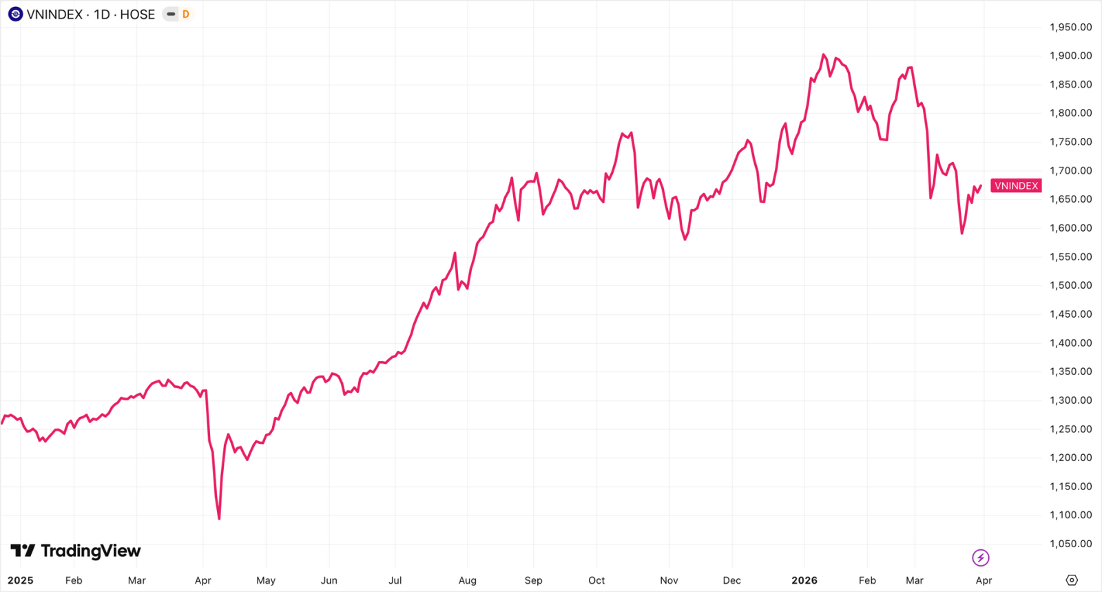 Chỉ riêng nhóm Vingroup (VIC, VHM, VPL, VRE) đã làm mất gần 60 điểm của VN-Index từ đầu năm 2026. Áp lực chốt lời sau một năm tăng rất mạnh là điều khó tránh khỏi. Trong năm 2025 trước đó, “bộ tứ siêu đẳng” của tỷ phú Phạm Nhật Vượng là đầu tàu đóng góp phần lớn vào mức tăng 40% của chỉ số.