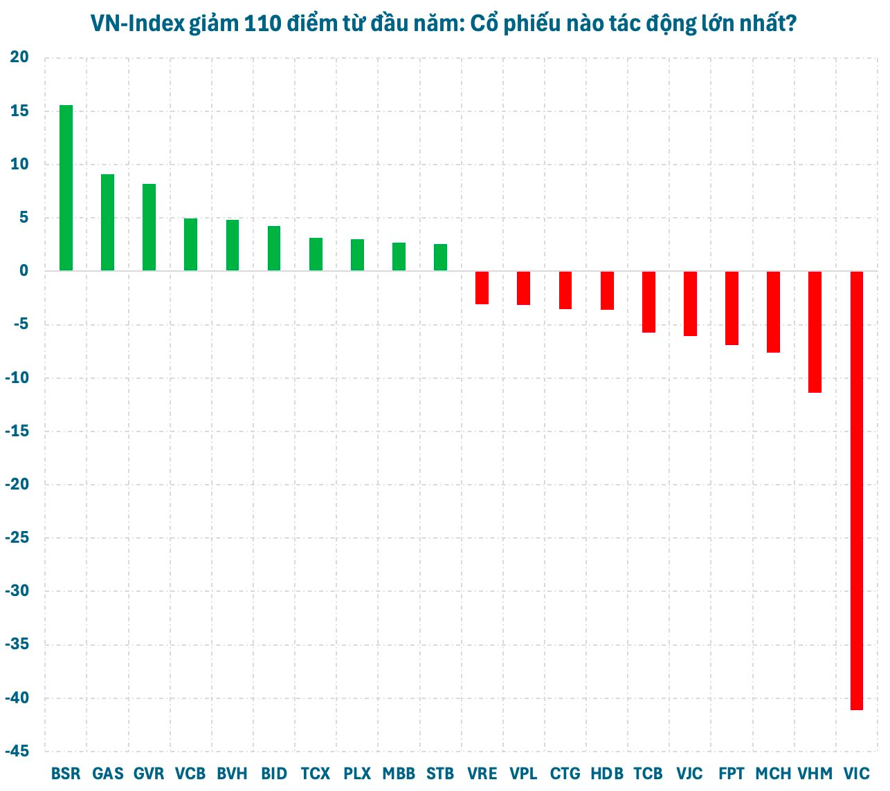 Chiều ngược lại, các cổ phiếu đóng góp lớn vào VN-Index từ đầu năm 2026 chủ yếu là nhóm do Nhà nước chi phối thuộc các ngành như Dầu khí (BSR, GAS, PLX), Ngân hàng - Bảo hiểm (VCB, BID, BVH), Cao su (GVR). Đa phần các cổ phiếu này đều có giai đoạn tăng nóng trước khi đảo chiều điều chỉnh sâu nhưng vẫn cao hơn so với đầu năm.