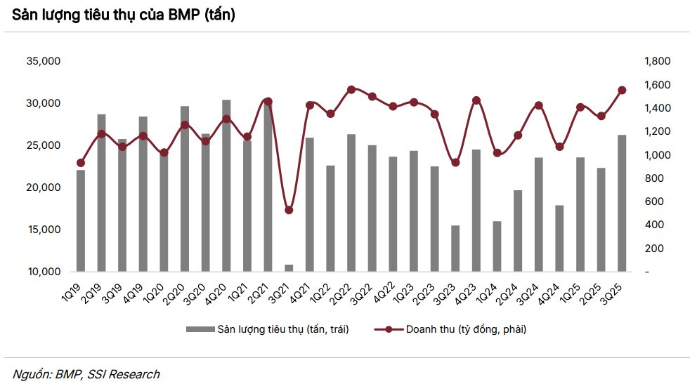 Dựa trên các phân tích trên, SSI Research dự báo quý 4/2025, doanh thu của BMP ước đạt 1.253 tỷ đồng và lợi nhuận ròng đạt hơn 285 tỷ đồng, lần lượt tăng 17% và 24% so với cùng kỳ năm ngoái. Cho cả năm 2025, doanh thu thuần BMP dự báo đạt 5.480 tỷ đồng và lợi nhuận ròng đạt 1.270 tỷ đồng, lần lượt tăng trưởng 19% và 28% so với năm 2024.
