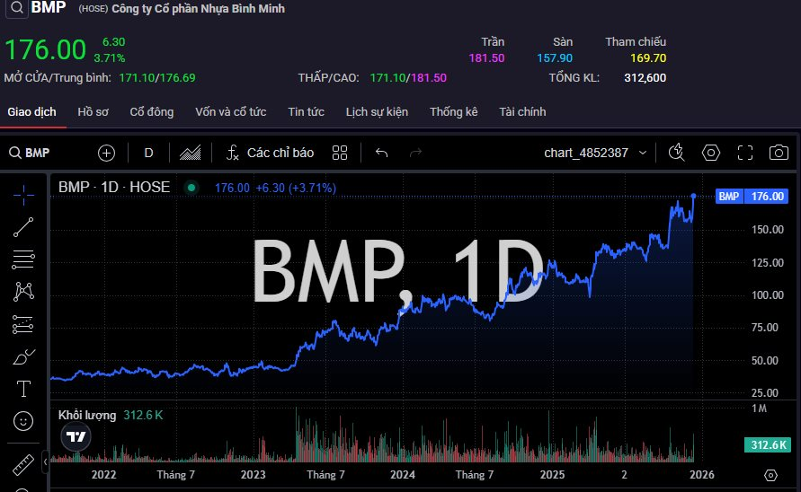 Trái ngược với diễn biến chung, cổ phiếu CTCP Nhựa Bình Minh (mã: BMP) tiếp đà giao dịch thăng hoa. Thị giá BMP có thời điểm nhuộm “sắc tím” trước khi đóng cửa ở mức 176.000 đồng/cp, tương ứng mức tăng 3,7%, đồng thời đánh dấu mốc đỉnh lịch sử mới (tính theo giá đã điều chỉnh). Vốn hóa thị trường BMP lần đầu tiên vượt 14.400 tỷ đồng,