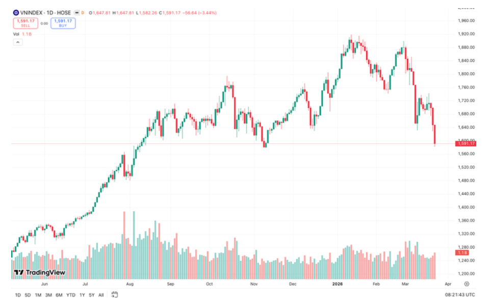Kết phiên 23-3, VN-Index giảm 56,64 điểm (-3,44%), xuống 1.591,17 điểm, đánh dấu phiên giảm thứ ba liên tiếp với tổng mức mất điểm khoảng 122 điểm, lùi về vùng thấp nhất trong 5 tháng. Các chỉ số còn lại cũng đồng loạt lao dốc: HNX-Index giảm 2,43%, UPCoM-Index mất gần 2%.