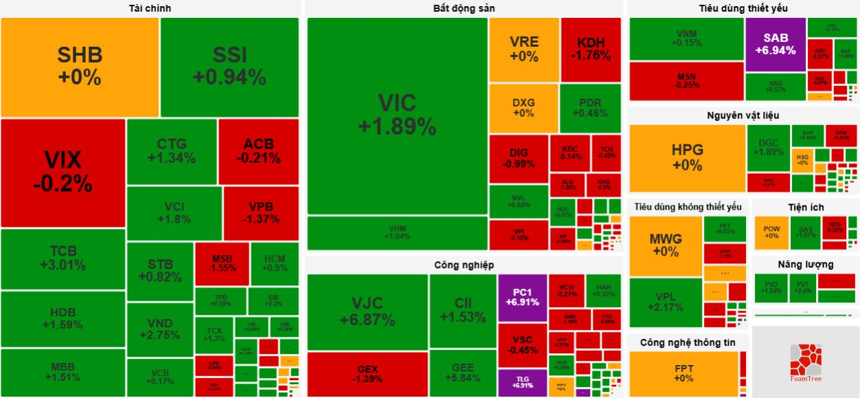 Ngoài ra, loạt cổ phiếu vốn hóa lớn tại các nhóm ngành khác tăng bứt phá trong phiên, như: VPL +2,17%, GEE +5,84%, VJC +6,87%, CII +1,53%, PC1 +6,91%, PVD +1,54%, GAS +1,07%, DGC +1,89%, GVR +3,93%, …