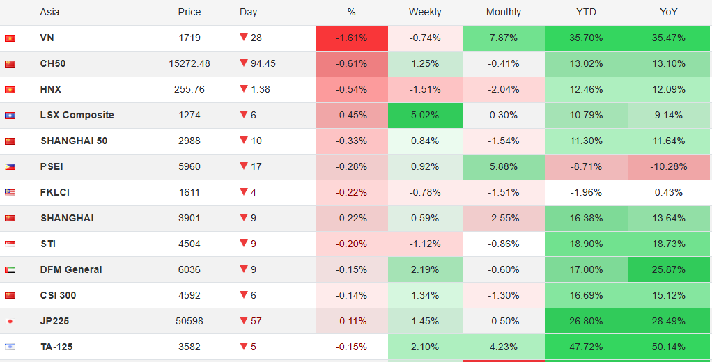 Ngoài ra, thị trường còn ghi nhận loạt cổ phiếu vốn hóa lớn điều chỉnh mạnh, gây áp lực lên chỉ số chính, như: GEE -6,8%, SAB -3,38%, MWG -1,19%, FPT -1,34%, VIX -2,13%, GEX -3,26%, VJC -1,7%, …