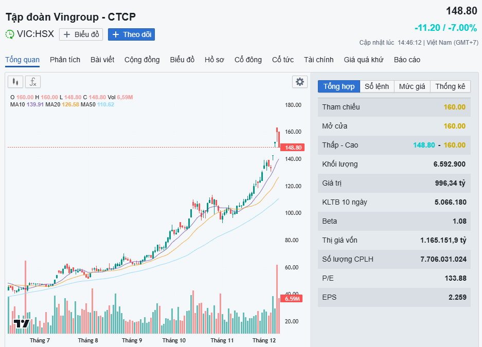 Kết phiên 10/12, giá cổ phiếu VIC ở mức 148.800 đồng/cổ phiếu, giảm 7% so với phiên trước, khối lượng cổ phiếu giao dịch khớp lệnh đạt gần 6,6 triệu đơn vị. Đà sụt giảm mạnh này, khiến vốn hóa thị trường của Vingroup giảm sâu xuống mức 1.146.657 tỷ đồng.