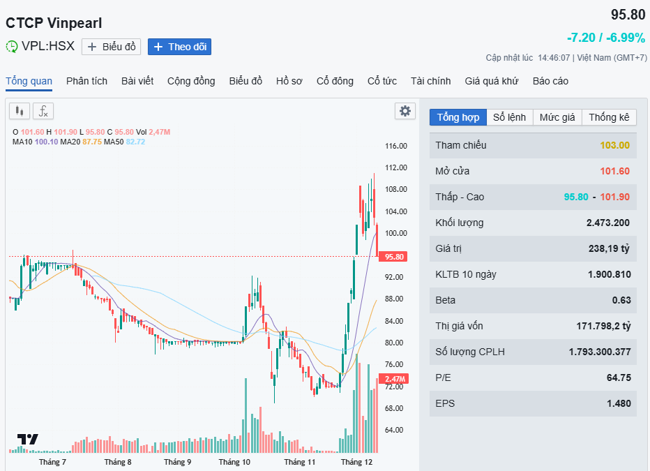 Đây là phiên giảm điểm sâu thứ 2 của cổ phiếu VPL sau chuỗi phiên “thăng hoa”, thị giá liên tục tăng “bốc đầu”. Vốn hóa thị trường của Vinpearl hiện giảm xuống mức 171.798 tỷ đồng.