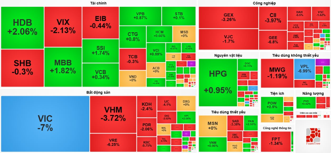 Ngược lại, cổ phiếu ngân hàng trở thành điểm sáng, kéo chỉ số chính khỏi đà giảm sâu, với: HDB +2,06%, MBB +1,82%. Theo sau là loạt mã tăng dưới 1%, như: VCB, CTG, VPB, STB, VIB, SSB, BID, LPB, …