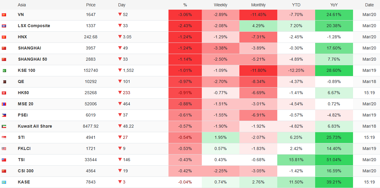 Kết phiên 20-3, VN Index giảm 51,32 điểm, tương đương 3%, xuống 1.647,8 điểm. Bảng điện HoSE ghi nhận 95 mã tăng so với 241 mã giảm, trong đó có 10 mã giảm sàn.