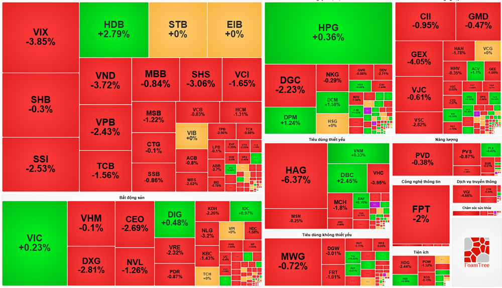 Lực bán bao trùm phần lớn các nhóm ngành, đặc biệt là ngân hàng - nhóm có ảnh hưởng lớn nhất đến chỉ số.