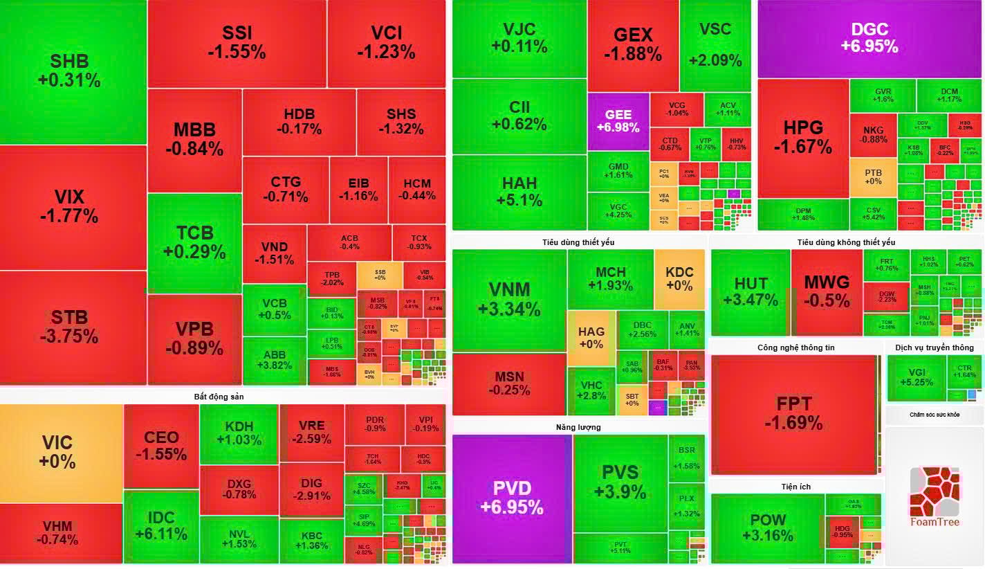 Ngược lại, GEE tăng mạnh, cùng với DGC, VNM và nhóm dầu khí trở thành điểm tựa giúp chỉ số không giảm sâu.