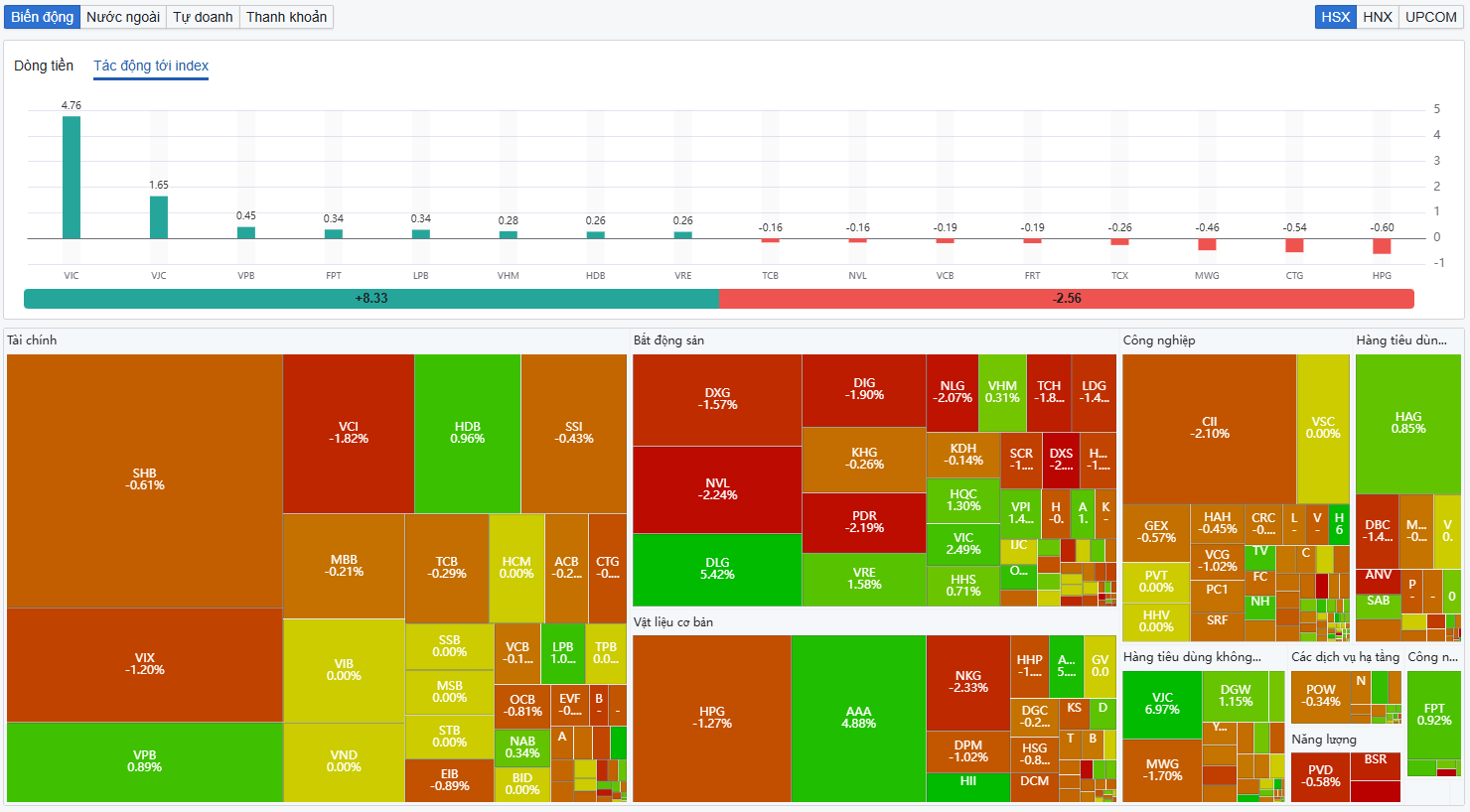 Một số cổ phiếu tài chính và công nghiệp cũng gây áp lực lên chỉ số như VIX giảm 1,2%, VCI giảm 1,82%, TCX giảm 1,11%; ACV giảm 1,82%, CII giảm 2,1%, VGC giảm 1,64%, BMP giảm 3,25%, VCG giảm 1,02% và SCS giảm 1,06%. Ngược lại, các mã như HDB tăng 0,96%, VPB tăng 0,89%, LPB tăng 1,01%; GEE tăng 1,01%, TV2 tăng 3,38% và VJC tăng hết biên độ.