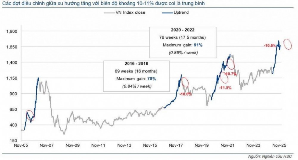Từ đáy ngày 16/6 đến ngày 5/12, VN-Index đã tăng 32% trong gần 6 tháng, cả về thời gian và mức tăng đều tương đương 1/3 chu kỳ của hai Uptrend gần nhất. Đáng chú ý, nhịp điều chỉnh trên 10%, vốn là đặc điểm thường thấy trong mọi chu kỳ tăng lớn, đã xuất hiện vào giữa tháng 10 khi VN-Index giảm 10,6%. Diễn biến này giúp thị trường tái tạo vùng hỗ trợ mới trước khi quay lại xu hướng tăng dài hạn.