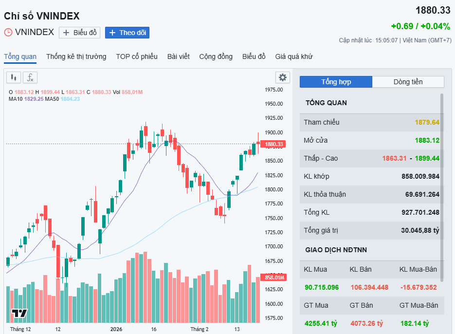 Chỉ số VN-Index theo đó rung lắc nhẹ và kết phiên gần như không đổi. Kết phiên giao dịch cuối cùng của tháng 2, sàn HOSE có 132 mã tăng và 202 mã giảm, VN-Index tăng 0,69 điểm (+0,04%), lên 1.880,33 điểm. Tổng khối lượng giao dịch đạt hơn 927,7 triệu đơn vị, giá trị 30.045,9 tỉ đồng.