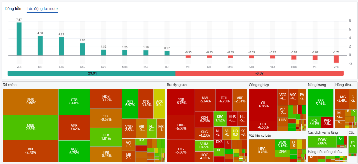 Độ rộng thị trường phản ánh rõ trạng thái "xanh vỏ, đỏ lòng" khi chỉ số VN-Index tăng nhưng số cổ phiếu giảm giá chiếm phần ưu thế so với số cổ phiếu tăng giá. Thống kê trên sàn HoSE, hôm nay có 107 mã tăng giá, 53 mã giữ giá tham chiếu nhưng có tới 219 mã giảm giá.