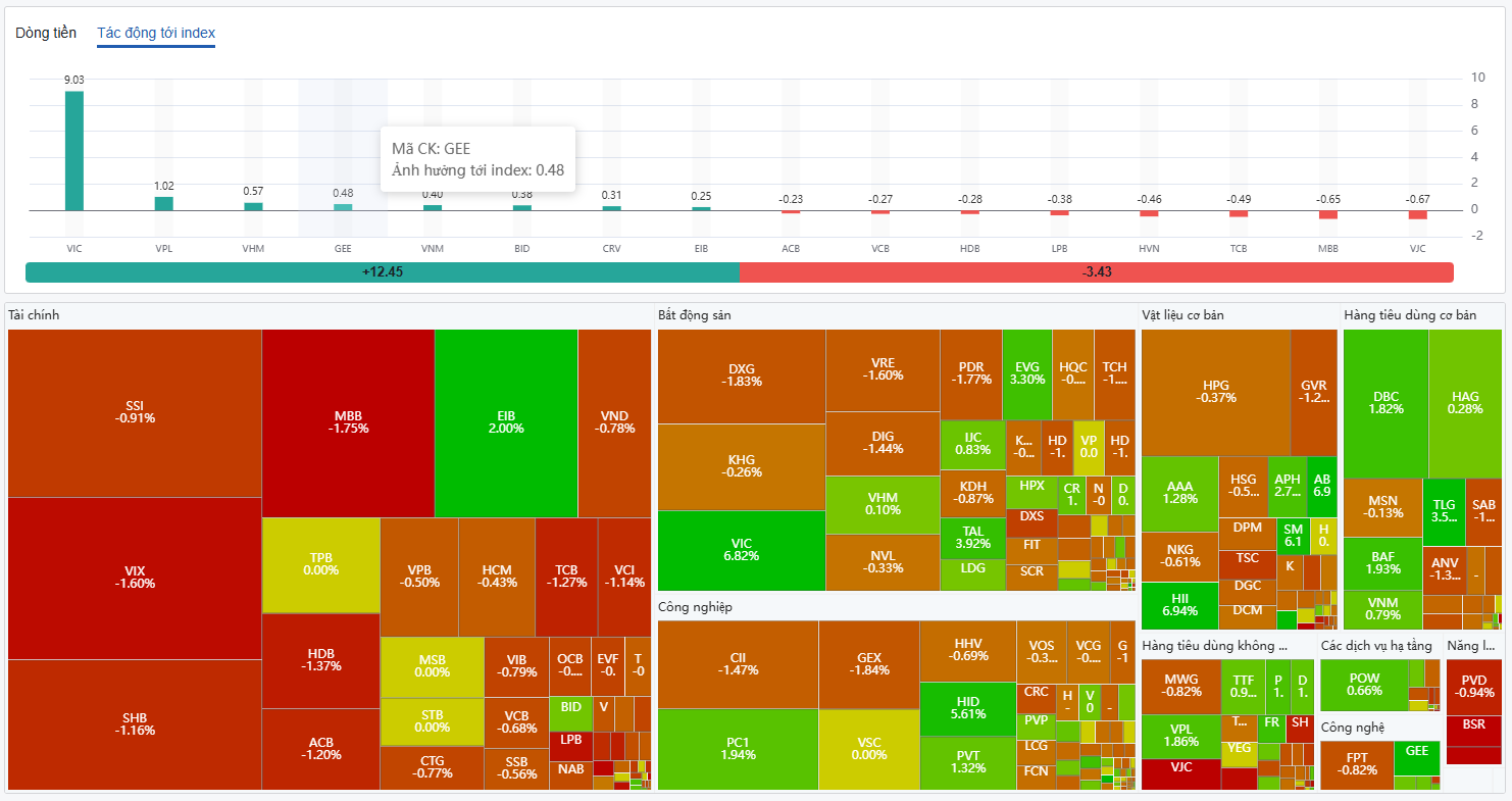 Khi VIC hạ nhiệt nhẹ và nhóm bluechip tiếp tục chịu áp lực bán, VN-Index lùi dần về vùng 1.745 điểm sau hơn 1 giờ giao dịch. Quãng thời gian còn lại của phiên sáng không có nhiều thay đổi, chỉ số chủ yếu đi ngang trong trạng thái thiếu đồng thuận.