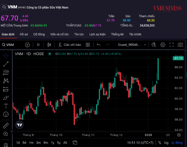 Phiên 14/1, cổ phiếu VNM của Vinamilk tiếp tục tăng trần lên mức 67.700 đồng/cp, trong tình trạng trắng bên bán, đánh dấu phiên “tím” thứ 2 liên tiếp. Đây cũng là mức giá cao nhất kể từ tháng 9/2023.
