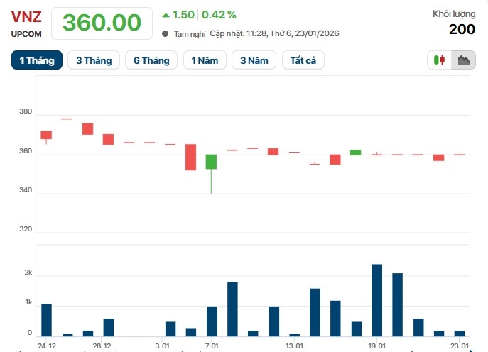 Sau chuỗi giảm điểm nhiều phiên liên tiếp, cổ phiếu VNZ của Công ty Cổ phần Tập đoàn VNG “xanh” tích cực ngay khi bước vào phiên sáng 23/1. Tuy nhiên, khối lượng giao dịch èo uột, chỉ đạt 200 đơn vị trong cả phiên sáng.