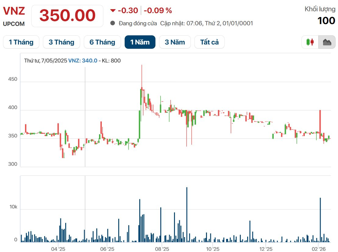 Kết thúc phiên giao dịch cuối năm Ất Tỵ 2025, giá cổ phiếu VNZ của CTCP Tập đoàn VNG đóng cửa ở mức giá 350.000 đồng/cp, là cổ phiếu có giá cao nhất thị trường. Vốn hóa doanh nghiệp hơn 10.000 tỷ đồng.