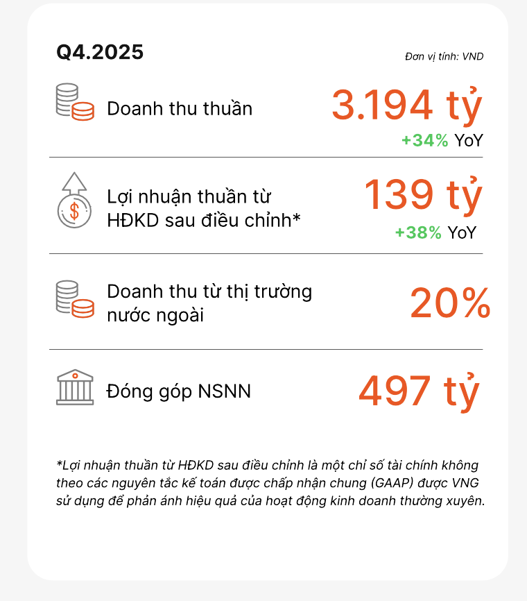 Quý IV/2025, CTCP Tập đoàn VNG (VNG Group) ghi nhận doanh thu thuần đạt 3.194 tỷ đồng, tăng trưởng 34% so với cùng kỳ, cùng với lợi nhuận thuần từ hoạt động kinh doanh sau điều chỉnh đạt 139 tỷ đồng, tăng 38%.