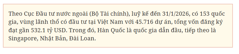Về đối tác đầu tư, Singapore dẫn đầu về tổng vốn đăng ký trong tháng 01/2026, tiếp theo là Hàn Quốc, Trung Quốc và Nhật Bản.