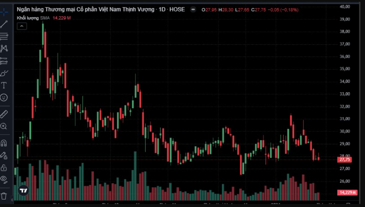 Tại phiên giao dịch 28/1, thị giá cổ phiếu VPB quanh mốc 27.700 đồng/ đơn vị, giảm so với mức 31.000 đồng/ đơn vị hồi tuần trước.