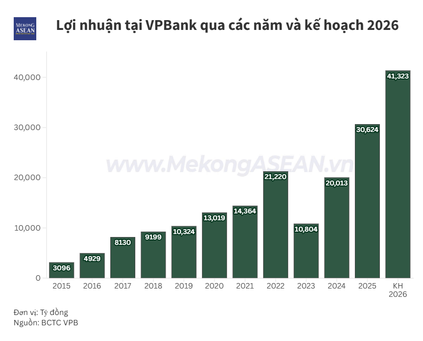 Về tình hình kinh doanh năm 2025, VPBank ghi nhận lợi nhuận trước thuế hợp nhất đạt 30.624 tỷ đồng, tăng mạnh so với mức 20.000 tỷ đồng của năm 2024, tương ứng tăng 53% YoY, qua đó lọt top các ngân hàng lãi trên 30.000 tỷ đồng bên cạnh nhóm Big 4 và Techcombank, MB.