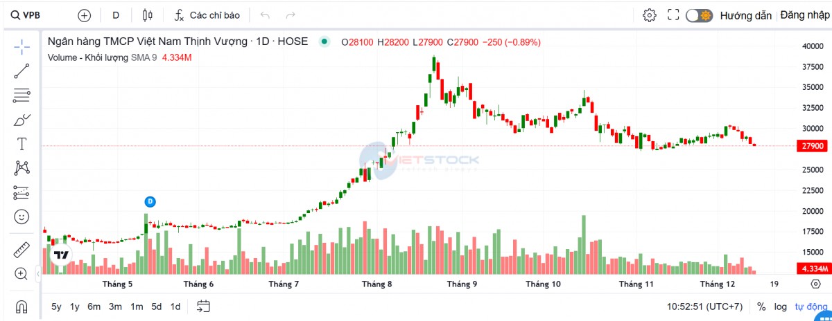 Trên thị trường chứng khoán, chốt phiên giao dịch ngày 11/12, cổ phiếu VPB ghi nhận giảm 850 đồng, tương đương giảm 2,93%, xuống mức 28.150 đồng/cổ phiếu, đảo chiều mạnh so với phiên 10/12, khi mã này còn tăng 250 đồng (tăng 0,87%) và đóng cửa tại mốc 29.000 đồng.