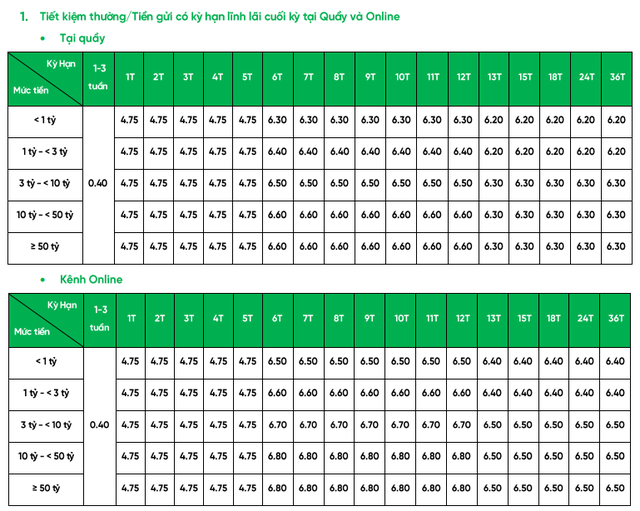 Cụ thể, các kỳ hạn 1–5 tháng trên kênh online vẫn giữ nguyên mức 4,75%/năm, tương tự kênh tại quầy.