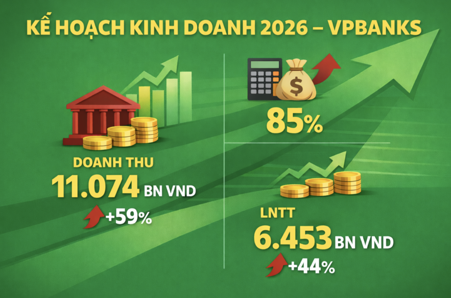 Ở một diễn biến khác, VPBankS đã ban hành nghị quyết HĐQT phê duyệt kế hoạch kinh doanh năm 2026 với mục tiêu tăng trưởng cao. Doanh nghiệp đặt kế hoạch tổng doanh thu đạt 11.074 tỷ đồng, tăng 59% so với kết quả thực hiện năm 2025. Dù tổng chi phí dự kiến tăng 85%, lợi nhuận trước thuế vẫn được kỳ vọng đạt 6.453 tỷ đồng, tương ứng mức tăng 44% so với năm trước.