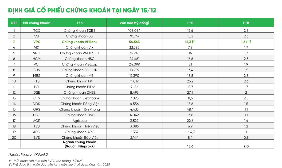 Đồng thời, cổ phiếu VPX cũng đang ở mức định giá hấp dẫn, với P/E dự phóng năm 2025 tính đến ngày 15/12 chỉ vào khoảng 15,3 lần, P/B ở mức 1,6 lần, so với trung bình ngành chứng khoán lần lượt là 15,6 lần và 2 lần.