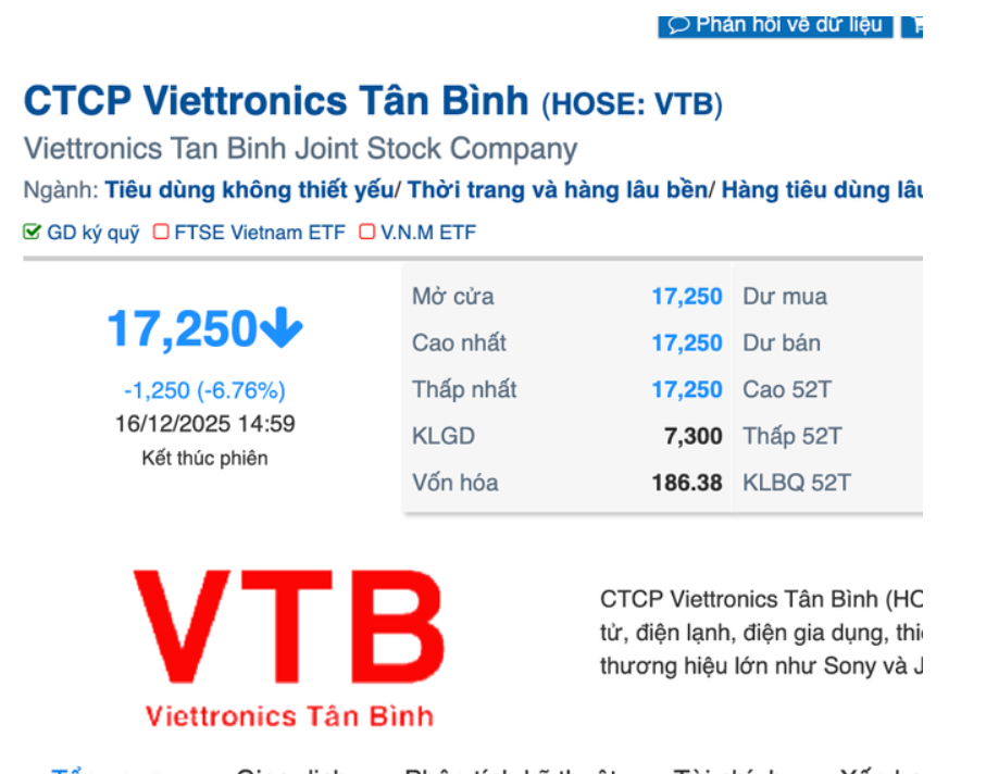 Giá cổ phiếu Viettronics Tân Bình- VTB tiếp tục giảm sàn phiên 16-12
