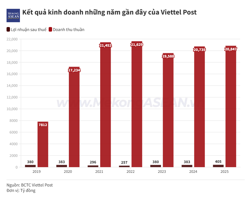 Lũy kế cả năm 2025, doanh thu thuần của Viettel Post đạt 20.846,8 tỷ đồng, tăng hơn 112 tỷ đồng so với mức thực hiện của năm 2024. Lợi nhuận sau thuế đạt 404,9 tỷ đồng, tăng 5,7% YoY. Đây là mức lợi nhuận sau thuế cao nhất từ trước đến nay của doanh nghiệp.