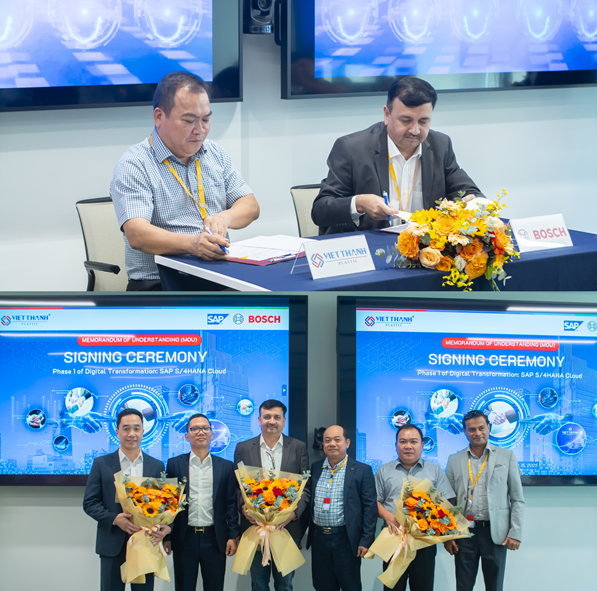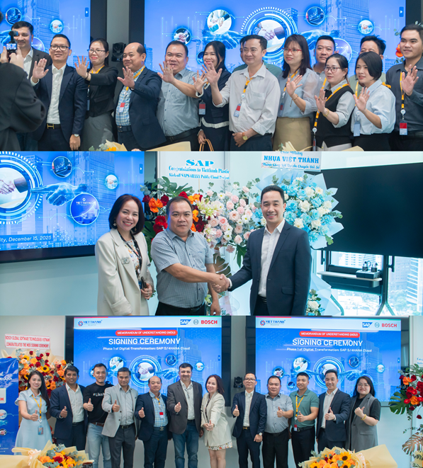 “Nhựa Việt Thành là một trong những doanh nghiệp tiên phong tại Việt Nam lựa chọn mô hình SAP S/4HANA Public Cloud. Đây là bước đi thể hiện tầm nhìn dài hạn và cam kết mạnh mẽ trong chiến lược chuyển đổi số. Với sự đồng hành của Bosch, dự án hứa hẹn sẽ đạt tiêu chuẩn quốc tế, đáp ứng nhanh chóng và hiệu quả trong định hướng mở rộng quy mô của doanh nghiệp.” - Đại diện Bosch chia sẻ tại Lễ ký kết và khởi động dự án.