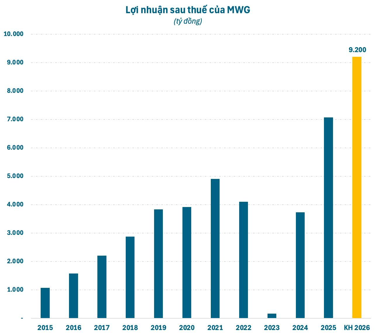 Năm 2026, Thế Giới Di Động dự kiến sẽ tiếp tục chính sách ESOP kèm KPI hoàn thành vượt kế hoạch kinh doanh. Đáng chú ý, doanh nghiệp đặt mục tiêu đầy tham vọng với doanh thu thuần 185.000 tỷ đồng và lợi nhuận sau thuế 9.200 tỷ đồng, tăng trưởng lần lượt 19% và 30% so với năm 2025.