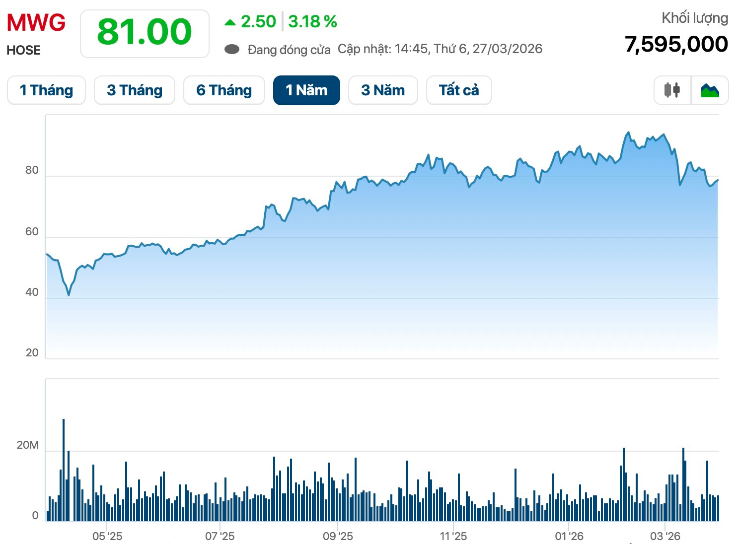 Theo tài liệu họp ĐHĐCĐ thường niên 2026, HĐQT Thế Giới Di Động sẽ trình cổ đông phương án phát hành hơn 7,3 triệu cổ phiếu ESOP (tỷ lệ 0,5%) với giá 10.000 đồng/cp. Trong khi đó, thị giá MWG hiện đang ở mức 81.000 đồng/cp (đóng cửa ngày 27/3), gấp 8 lần giá ESOP. Mặc dù bị hạn chế chuyển nhượng 2 năm nhưng đây vẫn là một món hời với những người được nhận.