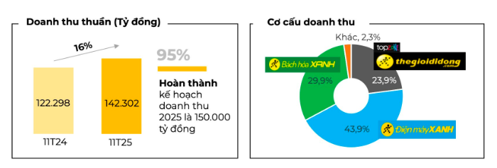 Trong cơ cấu doanh thu, hai chuỗi Thế Giới Di Động / Điện Máy Xanh (TGDĐ/ĐMX) ghi nhận doanh thu đạt 96.500 tỷ đồng, tăng 18% so với cùng kỳ và tích cực so với mặt bằng chung của ngành. Kênh online sau 11 tháng đạt gần 5.600 tỷ đồng, chiếm 5,8%.