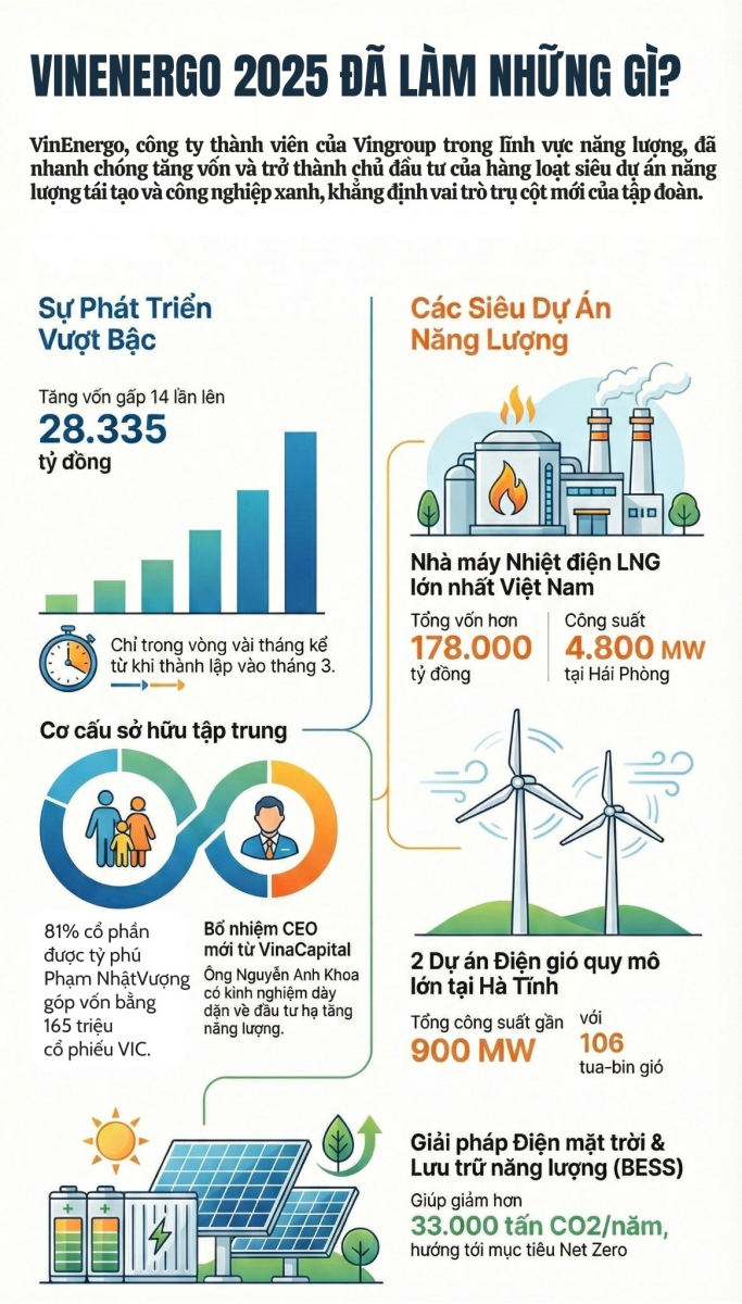 Từ đầu năm đến nay, VinEnergo - công ty thành viên của Tập đoàn Vingroup liên tục xuất hiện trong vai trò là chủ đầu tư các dự án điện, hạ tầng và công nghiệp xanh quy mô lớn tại Việt Nam.