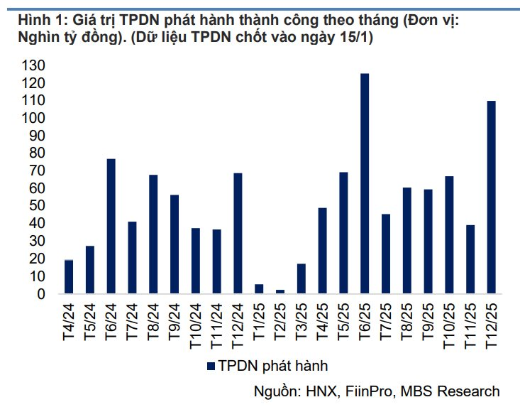 Tính riêng tháng 12, thị trường trái phiếu doanh nghiệp tháng 12 ghi nhận sự sôi động trở lại với 99 đợt phát hành, tổng giá trị đạt 109.800 tỷ đồng (tăng 181,5% so với tháng 11, tăng 60% so với cùng kỳ), ghi nhận mức phát hành theo tháng cao thứ hai trong năm 2025.