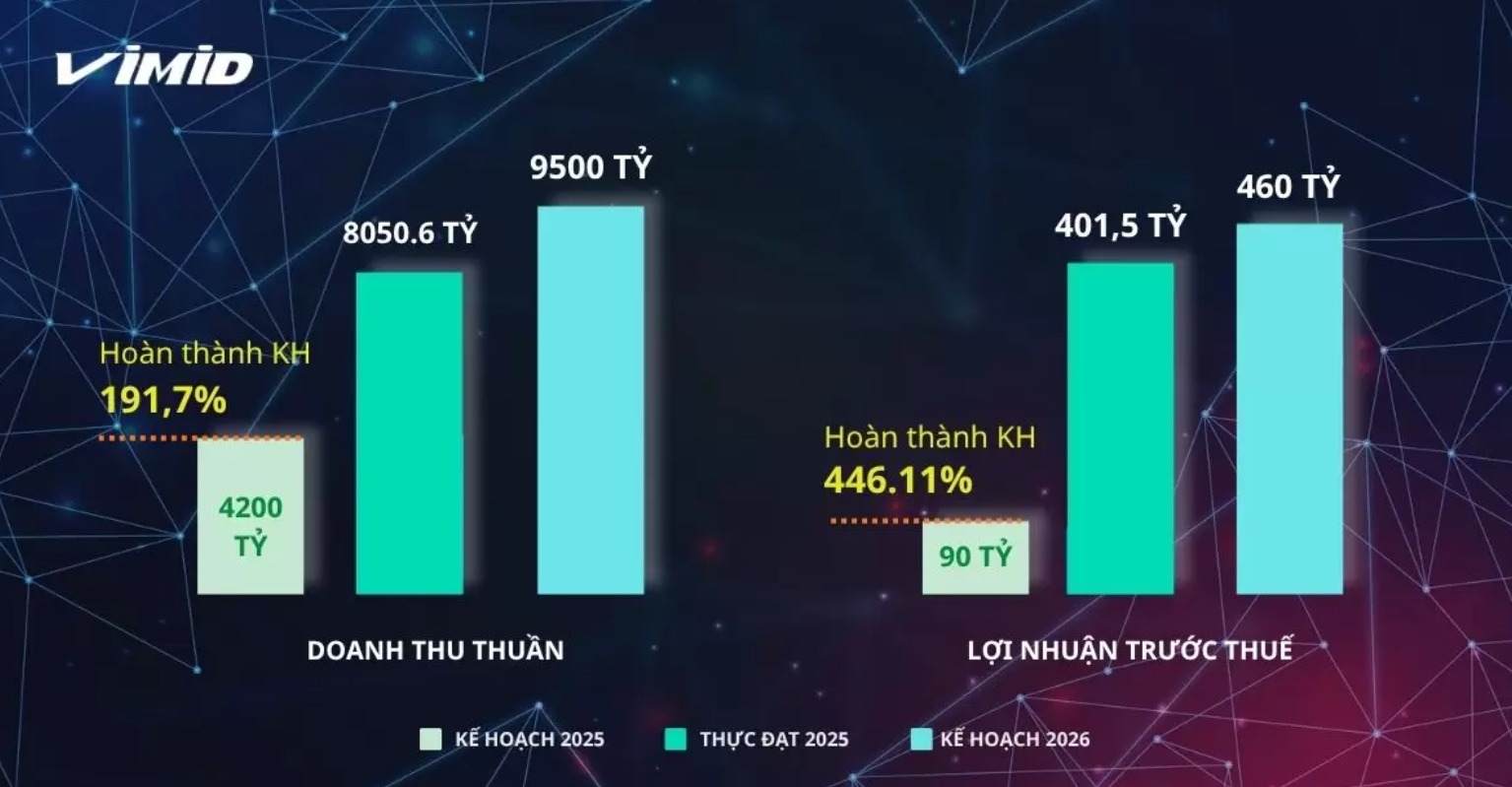 Trên nền tảng này, VIMID dự kiến trình cổ đông kế hoạch năm 2026 với định hướng tiếp tục duy trì đà tăng trưởng và mở rộng hoạt động. Theo dự thảo nghị quyết, VIMID đặt mục tiêu doanh thu 9500 tỷ, tăng trưởng ~18%; và mục tiêu lợi nhuận trước thuế 460 tỷ, tăng trưởng ~14,6%, kỳ vọng cao hơn và vượt chỉ tiêu năm trước.