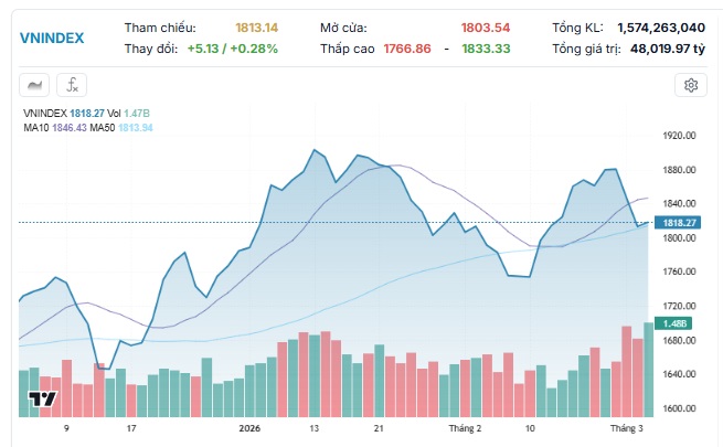 Phiên giao dịch ngày 04/03/2026, VN-Index đóng cửa ở mức 1,818.27 điểm, tăng 5.13 điểm ( 0.28%).