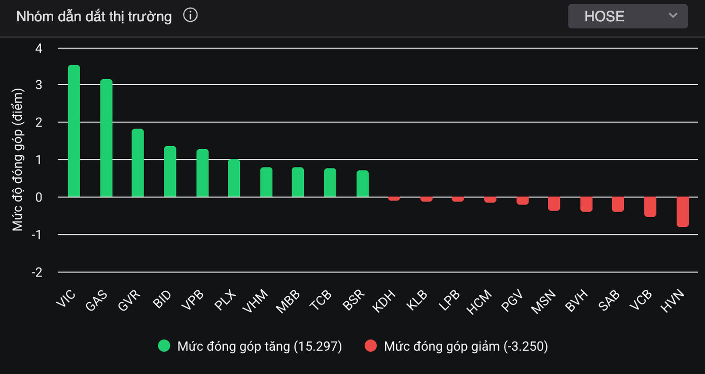 Nhóm Vingroup duy trì sức ảnh hưởng, VIC tăng 1,31%, đóng góp hơn 3 điểm cho VN-Index. Các mã liên quan như VHM, VRE cũng duy trì sắc xanh. Nhóm ngân hàng tiếp tục là trụ đỡ chính của thị trường. VPB dẫn đầu đà tăng, hơn 2% sau thông tin mới về cổ đông ngoại, UBS AG London sở hữu hơn 1% vốn VPBank.