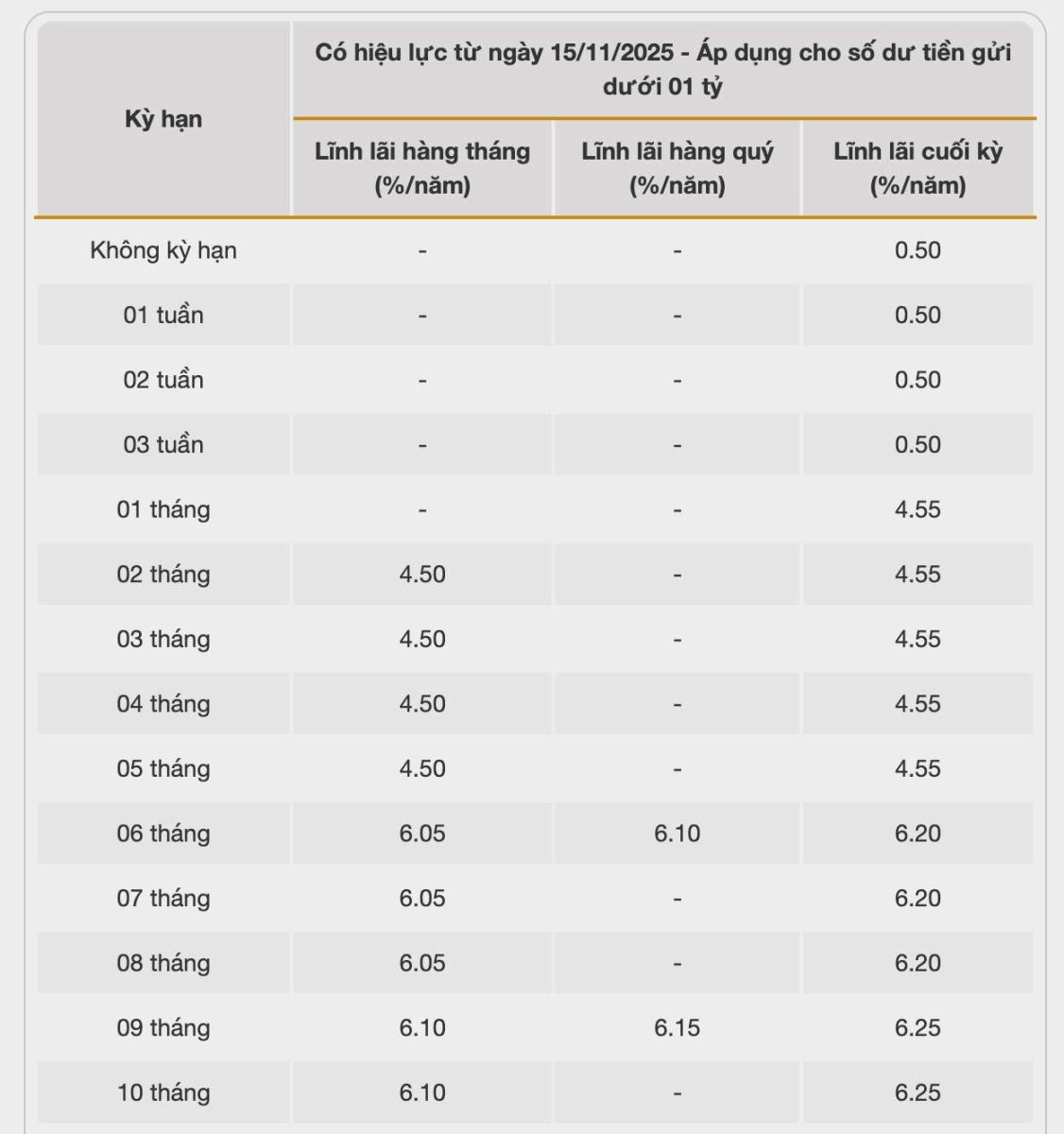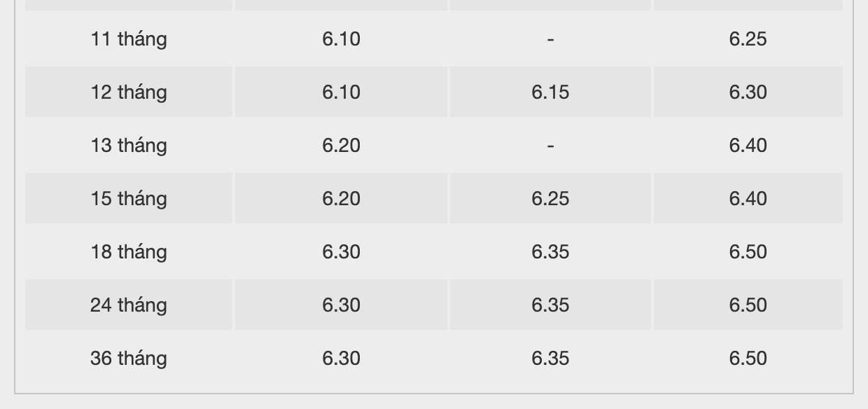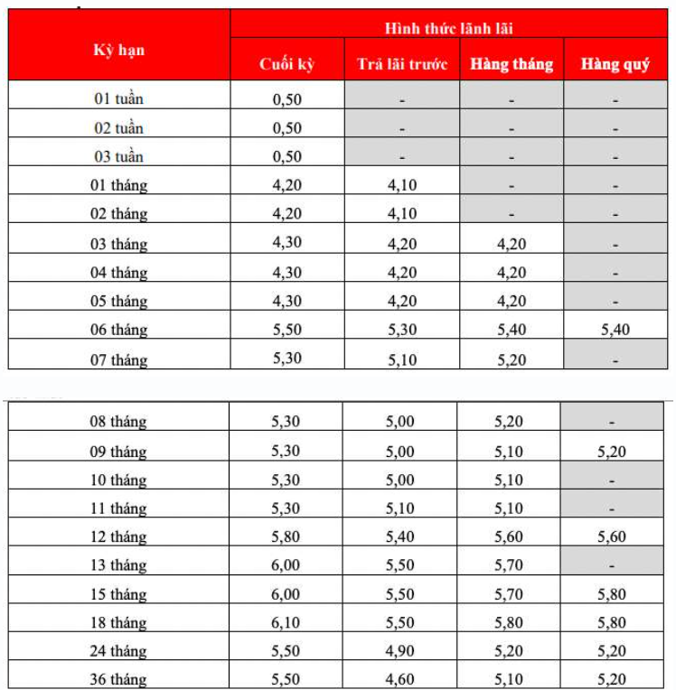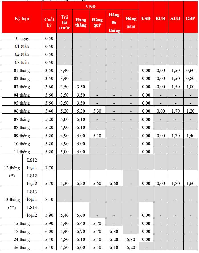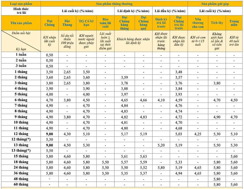 * Thông tin về lãi suất chỉ mang tính chất tham khảo và có thể thay đổi trong từng thời kì. Vui lòng liên hệ điểm giao dịch ngân hàng gần nhất hoặc hotline để được tư vấn.