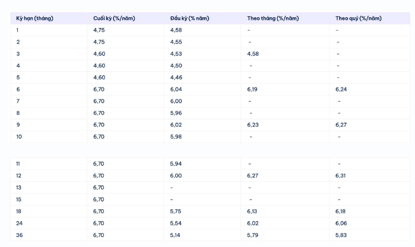 Vikki Bank đang niêm yết lãi suất cao nhất kỳ hạn 13 tháng ở mức 6,7%/năm khi khách hàng gửi tiền online, lĩnh lãi cuối kỳ. Ở những kỳ hạn khác, khách hàng niêm yết lãi suất ở mức 0,5-6,7%/năm.