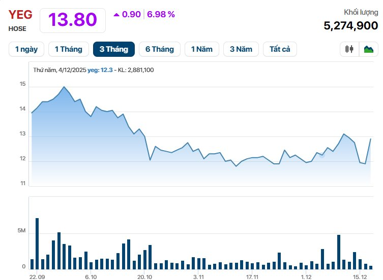 Bất chấp thị trường chung diễn biến giằng co, cổ phiếu YEG - Công ty Cổ phần Tập đoàn Yeah1 ghi nhận phiên tăng trần thứ 2 liên tiếp, thị giá leo lên mức 13.800 đồng/cp.