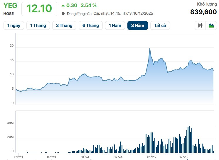 Trên thị trường, cổ phiếu YEG chốt phiên 16/12 đạt 12.100 đồng/cp.