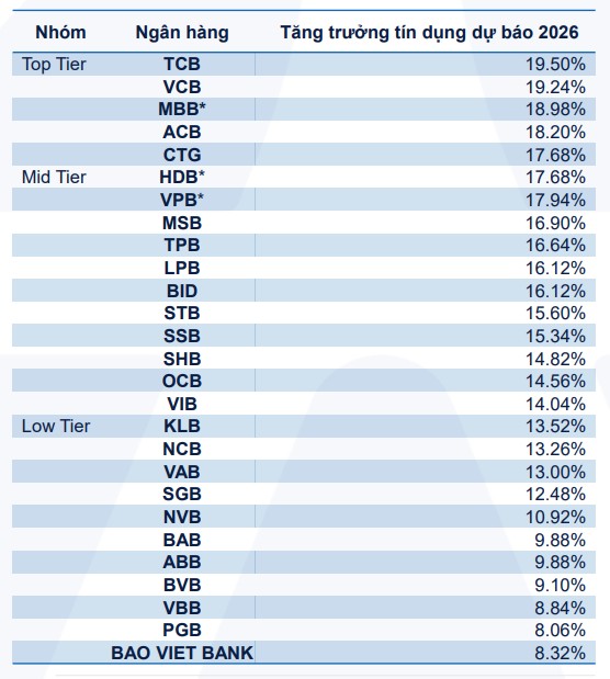 Ở chiều ngược lại, Yuanta cảnh báo các ngân hàng thuộc nhóm quy mô nhỏ (Low Tier) với room tăng trưởng tín dụng dưới 14% sẽ đối mặt với áp lực kép, bao gồm năng lực vốn hạn chế và nguy cơ gia tăng nợ xấu trong bối cảnh nhu cầu tín dụng vẫn ở mức cao.