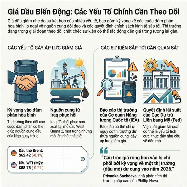 Giá dầu giảm nhẹ trong bối cảnh đàm phán hòa bình với Ukraine và quyết định về lãi suất của Hoa Kỳ được chú ý.