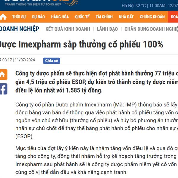 Công ty cổ phần Dược phẩm Imexpharm (Mã: IMP) thông báo sẽ lấy ý kiến cổ đông bằng văn bản để thông qua việc phát hành cổ phiếu tăng vốn cổ phần từ nguồn vốn chủ sở hữu (thưởng cổ phiếu) và hủy bỏ phư...Thêmvietnambiz.vn/...-co-phieu-100-202471181738727.htm