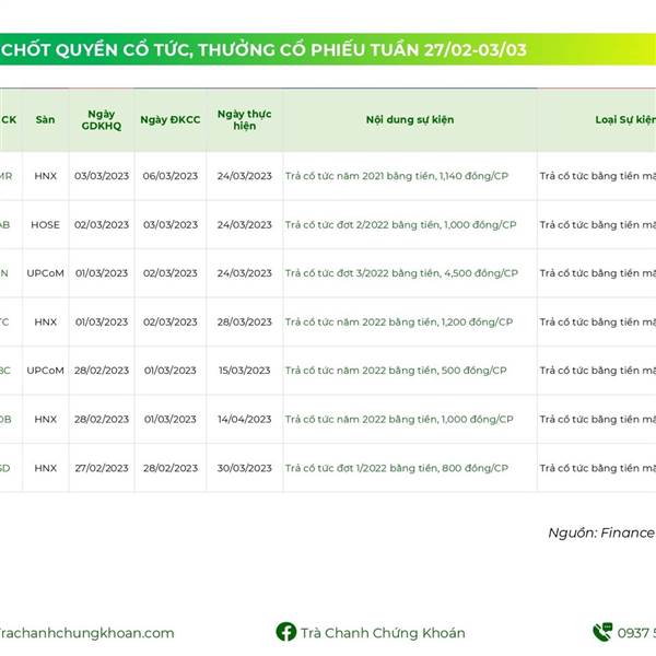 Lịch chốt quyền cổ tức tuần 26/2-1/3: Cổ tức tiền mặt cao nhất 20%